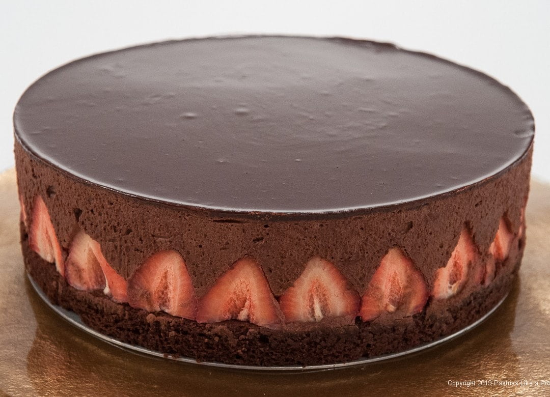 Make the Chocolate Mousse below and pour it over the strawberries. Rap the pan on the work surface several times while filling to seat the mousse between the strawberries and eliminate any air pockets. When you rap the pan, holes around the side may appear, simply fill them in and level the top.